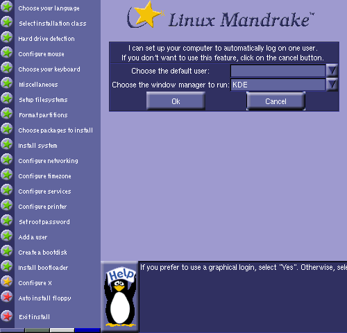 In Linux-Mandrake 7.2, a single user be chosen to automatically login and be taken to the desktop. This is a great idea if a certain user will be the only one using the system. Click the "Cancel" button if you'd prefer not to utilize this feature.