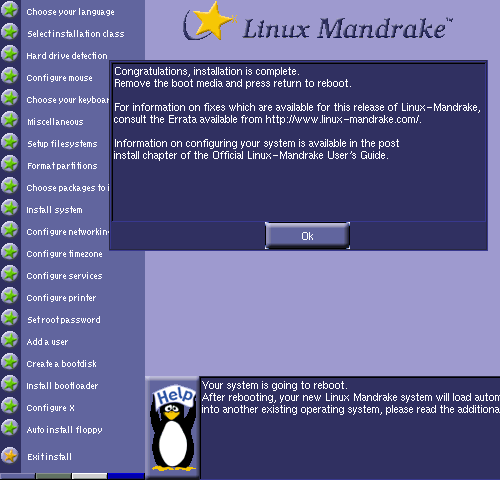 That was it, installation is now complete and your Linux system is ready to use. Just remove the boot floppy and select "Ok" to restart your PC. You can then boot into Linux or Windows as soon as the computer has booted up again.