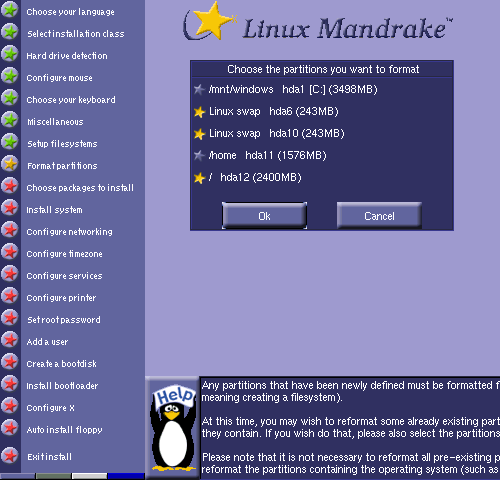 Next you'll be asked which of the Linux partitions to format. Normally you'll want to format all the Linux partitions unless you are re-using some from a previous installation, such as /home.